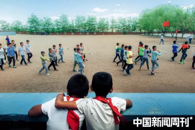 六一运动会前一天,鼓号队员在进行入场练习,两个小男孩搂着肩,在一旁看他们彩排。